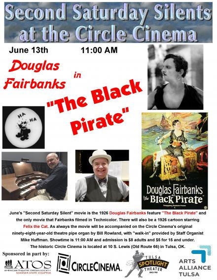 June's "Second Saturday Silent" movie is the 1926 Douglas Fairbanks feature "The Black Pirate" and the only movie that Fairbanks filmed in Technicolor. There will also be a 1926 cartoon starring Felix the Cat. As always the movie will be accompanied on the Circle Cinema's original ninety-eight-year-old theatre pipe organ by Bill Rowland, with "walk-in" provided by Staff Organist Mike Huffman.