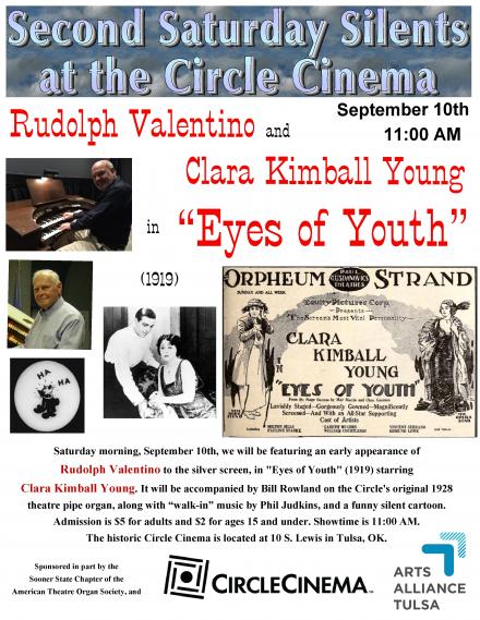 We are featuring an early appearance of Rudolph Valentino to the silver screen, in "Eyes of Youth" (1919) starring Clara Kimball Young. It will be accompanied by Bill Rowland on the Circle's 94-year-old theatre pipe organ, along with "walk-in" music by Phil Judkins, and a funny silent cartoon.