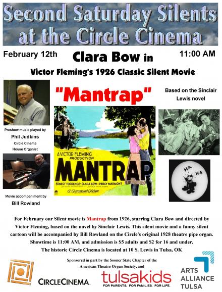 Our "Second Saturday Silents at the Circle Cinema" in Tulsa for February is a 1926 film starring Clara Bow. "Mantrap" is directed by Victor Fleming and based on a novel by Sinclair Lewis and also stars Ernest Torrence in what Clara considered her favorite among her own films. It features live accompaniment on the 94-year-old theatre pipe organ and a funny silent cartoon as well.