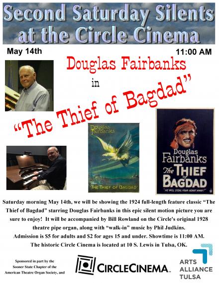 Saturday morning May 14th, we will be showing the 1924 full-length feature classic “The Thief of Bagdad” starring Douglas Fairbanks in this epic silent motion picture you are sure to enjoy! It will be accompanied by Bill Rowland on the Circle's original 1928 theatre pipe organ, along with “walk-in” music by Phil Judkins.