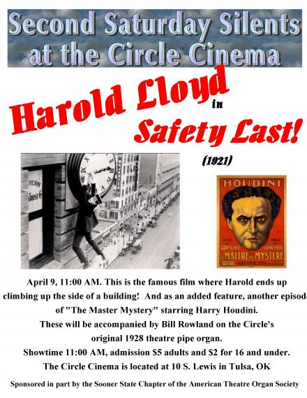 The next "Second Saturday Silents at the Circle Cinema" will be a showing of the sensational 1922 Harold Lloyd silent film "Safety Last", once again featuring live authentic accompaniment by Bill Rowland on their original theatre pipe organ. A second feature will be another episode of the 1919 serial starring Harry Houdini titled "The Master Mystery."