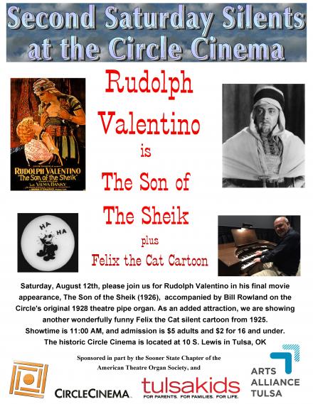 Saturday, August 12th, please join us for Rudolph Valentino in his final movie appearance, The Son of the Sheik (1926), accompanied by Bill Rowland on the Circle's original 1928 theatre pipe organ. As an added attraction, we are showing another wonderfully funny Felix the Cat silent cartoon from 1925.