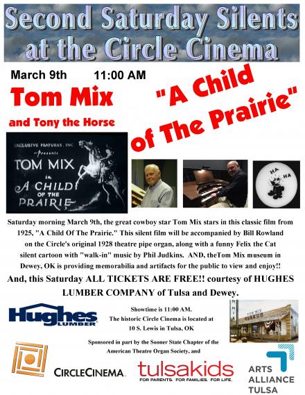 Come and see a silent movie as it was meant to be seen, with an authentic theatre pipe organ accompaniment! For our "Second Saturday Silents at the Circle Cinema" on March 9th at 11:00 we will be screening the 1925 feature silent film "A Child of The Prairie" starring Tom Mix. This silent film will be accompanied by Bill Rowland on the Circle's original 1928 theatre pipe organ, along with a funny Felix the Cat silent cartoon with "walk-in" music by Phil Judkins. The Tom Mix museum in Dewey, OK is providing memorabilia and artifacts for the public to view and enjoy, and, this Saturday ALL TICKETS ARE FREE!! courtesy of HUGHES LUMBER COMPANY of Tulsa and Dewey. The Circle Cinema is located at 10 South Lewis in Tulsa.