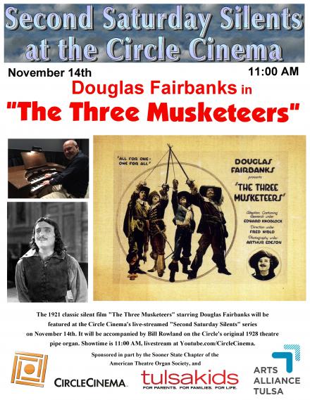 The Three Musketeers (Douglas Fairbanks, 1921) accompanied on their original 1928 theatre organ, available at https://www.circlecinema.org/