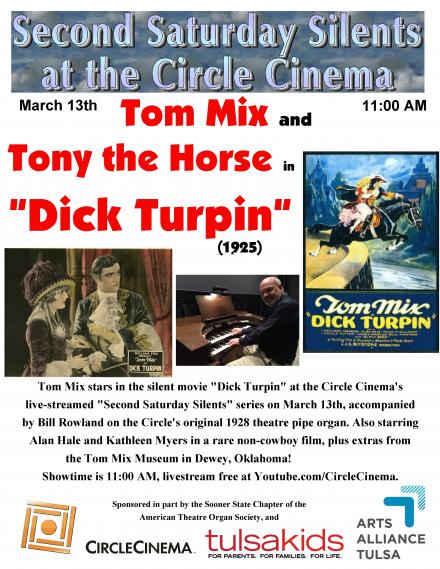 The 1925 film "Dick Turpin" starring Tom Mix, Alan Hale, and Kathleen Myers, will be accompanied on the Circle Cinema's original 1928 theatre pipe organ, plus historical artifacts from the Tom Mix Museum in Dewey, OK.
