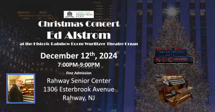 On Thursday, December 12th at 7pm, New York Yankees organist Ed Alstrom will be performing a Christmas concert on the historic, fully restored 1934 Wurlitzer Theatre Organ originally from the Rainbow Room at NYC's Rockefeller Center! Hear over 750 real organ pipes come to life from the walls of the Rahway Senior Center and take a tour of the pipe chambers after the concert.