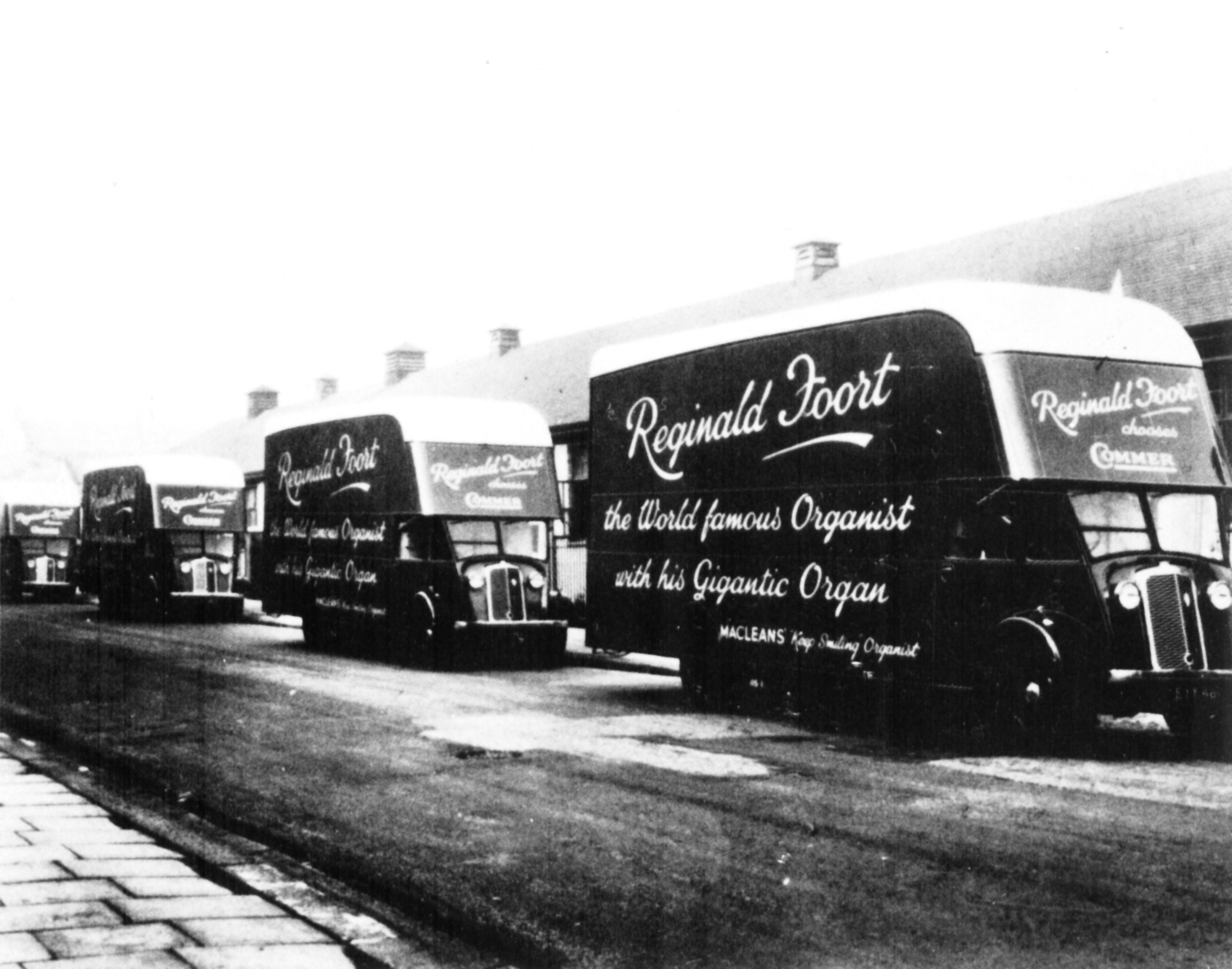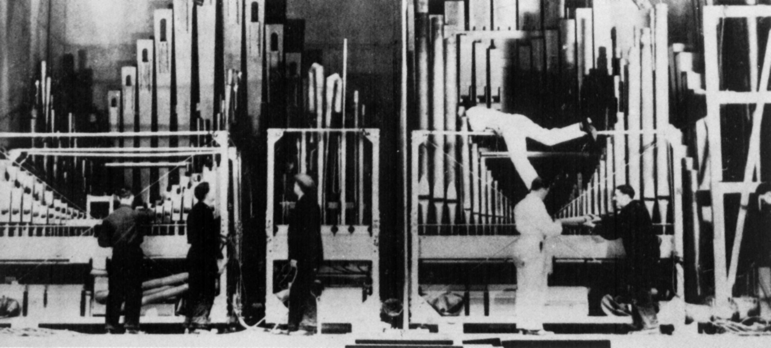 The Möller instrument was a marvel in many aspects. Weighing in at 30 tons, the “portable” organ had its 27 ranks distributed on nine steel frames, each self-contained with its own windchests, regulators, and tremulants. The frames were on giant casters which allowed them to be rolled on and off the four large trucks that made up the Foort caravan. They had to travel with six different blower motors—to account for the different electrical systems throughout Great Britain. |