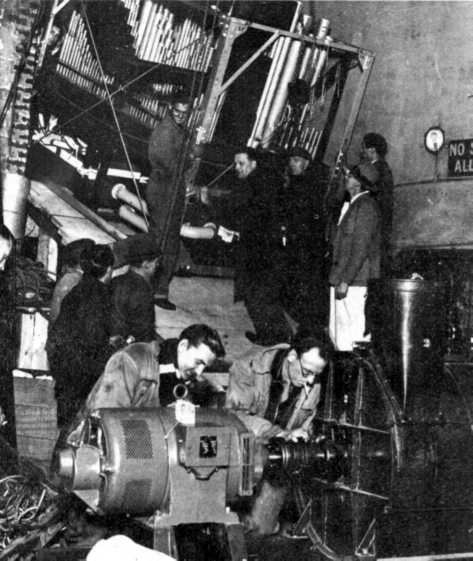 The moves were not entirely without mishap. If the audience noticed the lack of trumpet on the second visit to the Hippodrome Theatre in Birmingham, there was an explanation. When unloading this section, a rope had broken and the entire unit crashed into a wall, snapping off the resonators on 28 trumpet pipes. The organ also had some close calls when World War II began. During a week’s engagement at the Empire Theatre in Liverpool, bombs were dropping all around the theatre. At the Saturday evening performance, these explosions caused three fires in the theatre roof space, which were put out by the organ crew while the show continued. |