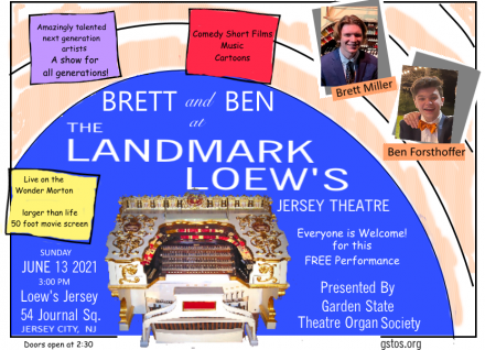 to bring your children, grandchildren, nieces, and nephews to share with you the joy of theatre organ music. Celebrating our return to the Loews Jersey, this performance is free.