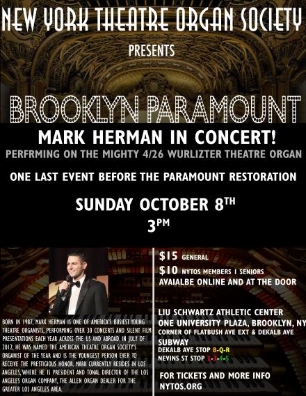 NYTOS is proud to present Mark Herman in concert on the original 4/26 Wurlitzer. Come hear the organ one last time in the best acoustics it has ever had. This will be the last event in the space before the LIU gym closes and is converted back into a performance space. A project that will take two years.