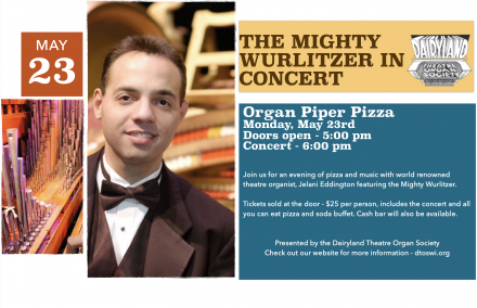 The Dairyland Theatre Organ Society is proud to present internationally renowned theatre organist Jelani Eddington in concert at Organ Piper Pizza in Greenfield, Wisconsin, on Monday, May 23rd at 6pm. Tickets for this event will be sold at the door for $25 each which will include the concert as well as dinner for the evening. Please see the flyer or www.dtoswi.org for more details.