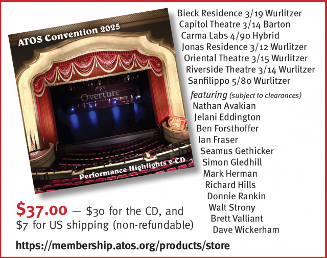 Pre-Order the 2025 Convention CD, with highlights of the concerts at the Milwaukee ATOS convention.